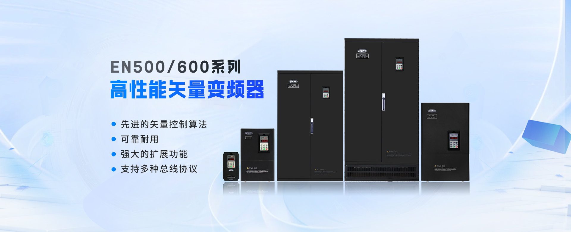 EN500/EN600系列高性能磁通矢量變頻器采用先進的控制方式實現了高轉矩、高精度、寬調速驅動,可實現有PG矢量控制,無PG矢量控制,具有速度矢量和轉矩矢量兩種工作方式,能快速限住沖擊電流,廣泛用于高端制造業。該系列產品控制精度高、速度響應快、低頻特性優越,智能檢測與保護完善,豐富的外圍總線擴展、端子擴展、繼電器擴展、模擬量擴展等。